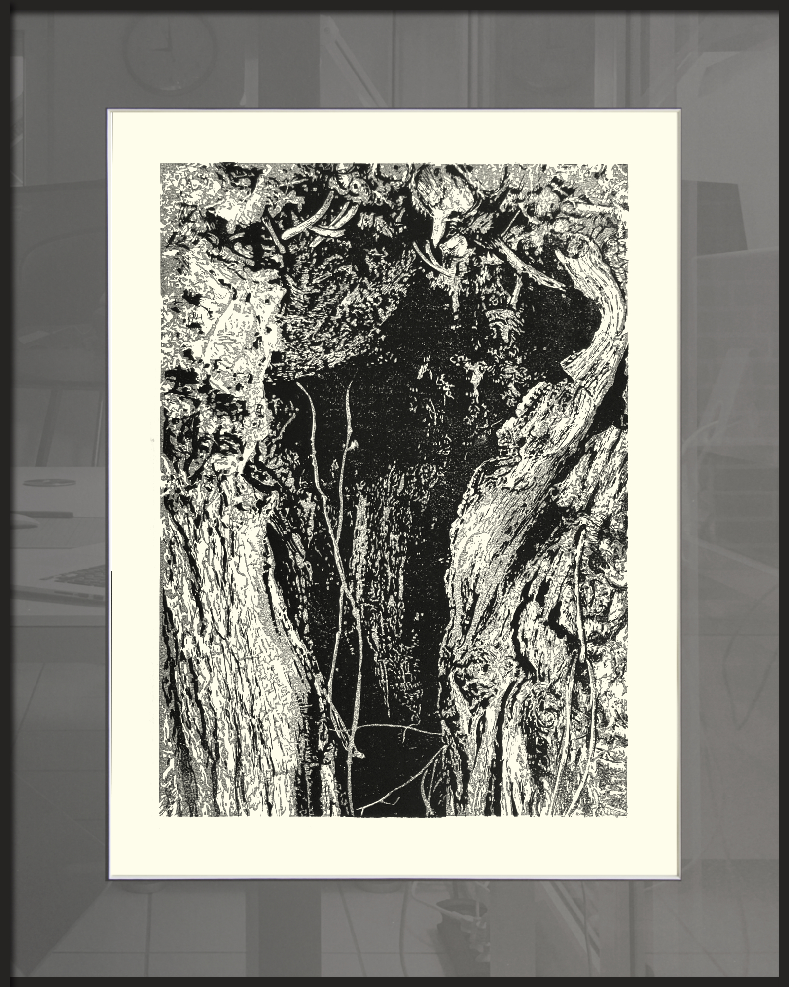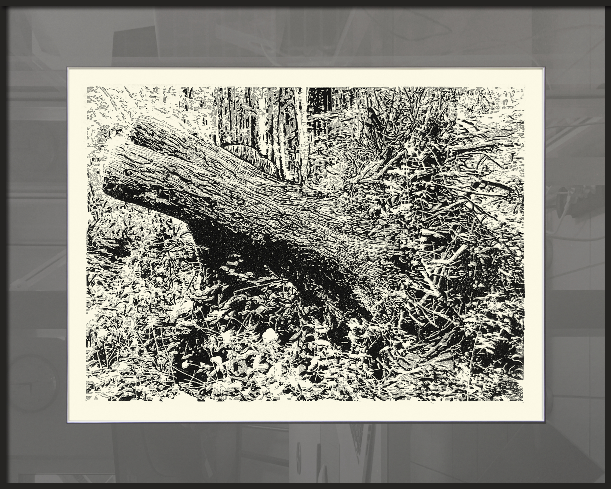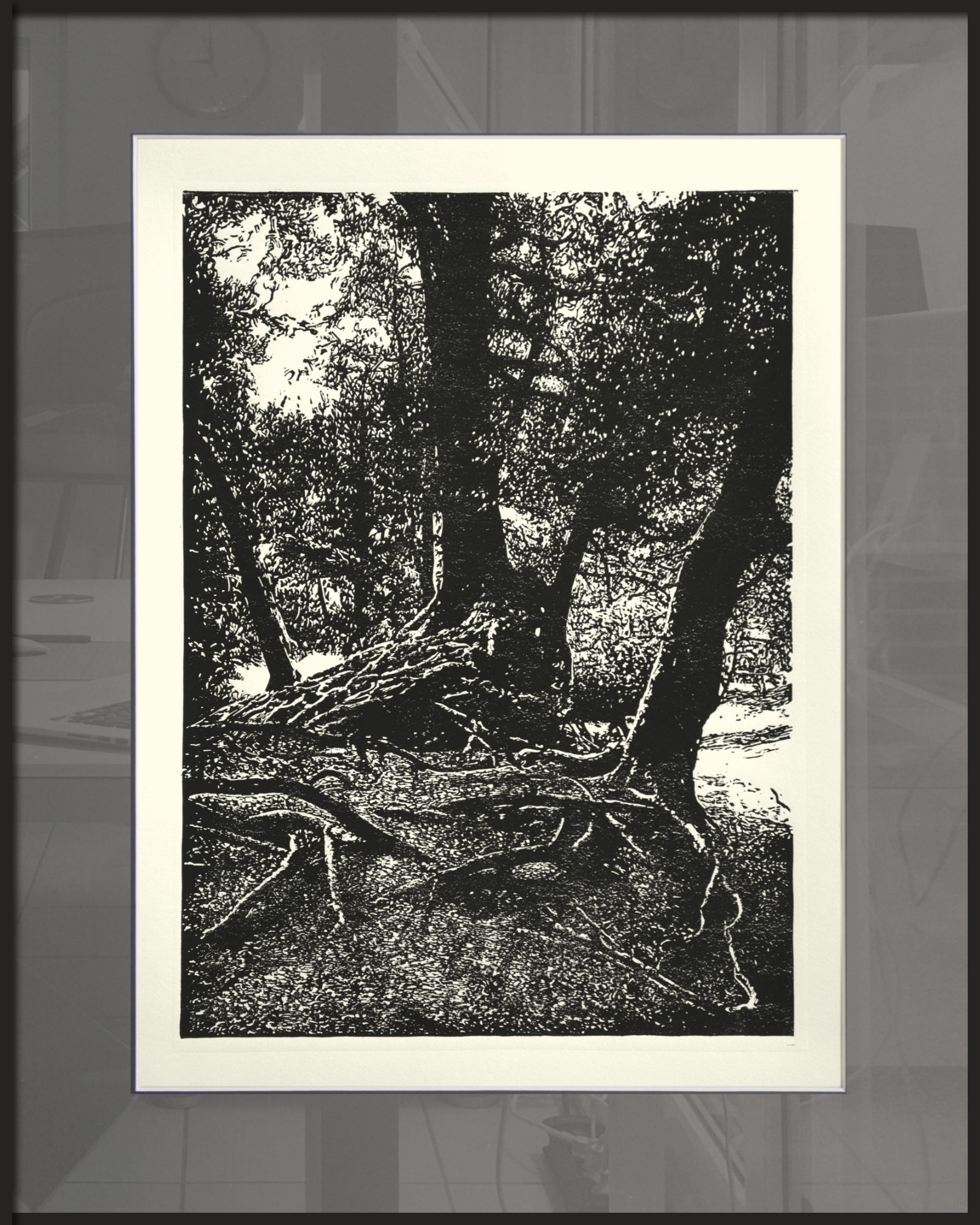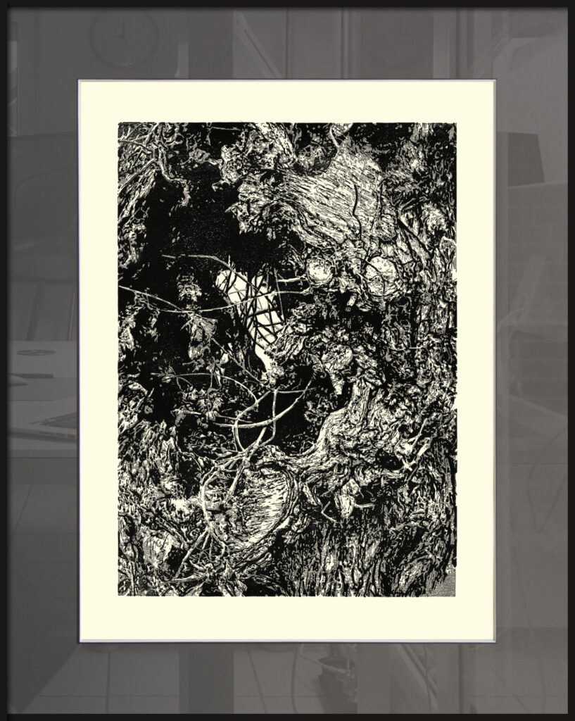 Linolschnitt (Oktober 2025) in einem Druckvorgang (Schwarz) gedruckt. 24,5 x 34,5 cm. 90 g/qm Romandruk Werkdruckpapier (leicht gelbliche Papierfarbe). Im Passepartout (dunkelgrau): 50 x 40 cm. Auflage: 12 (5/4/3)
