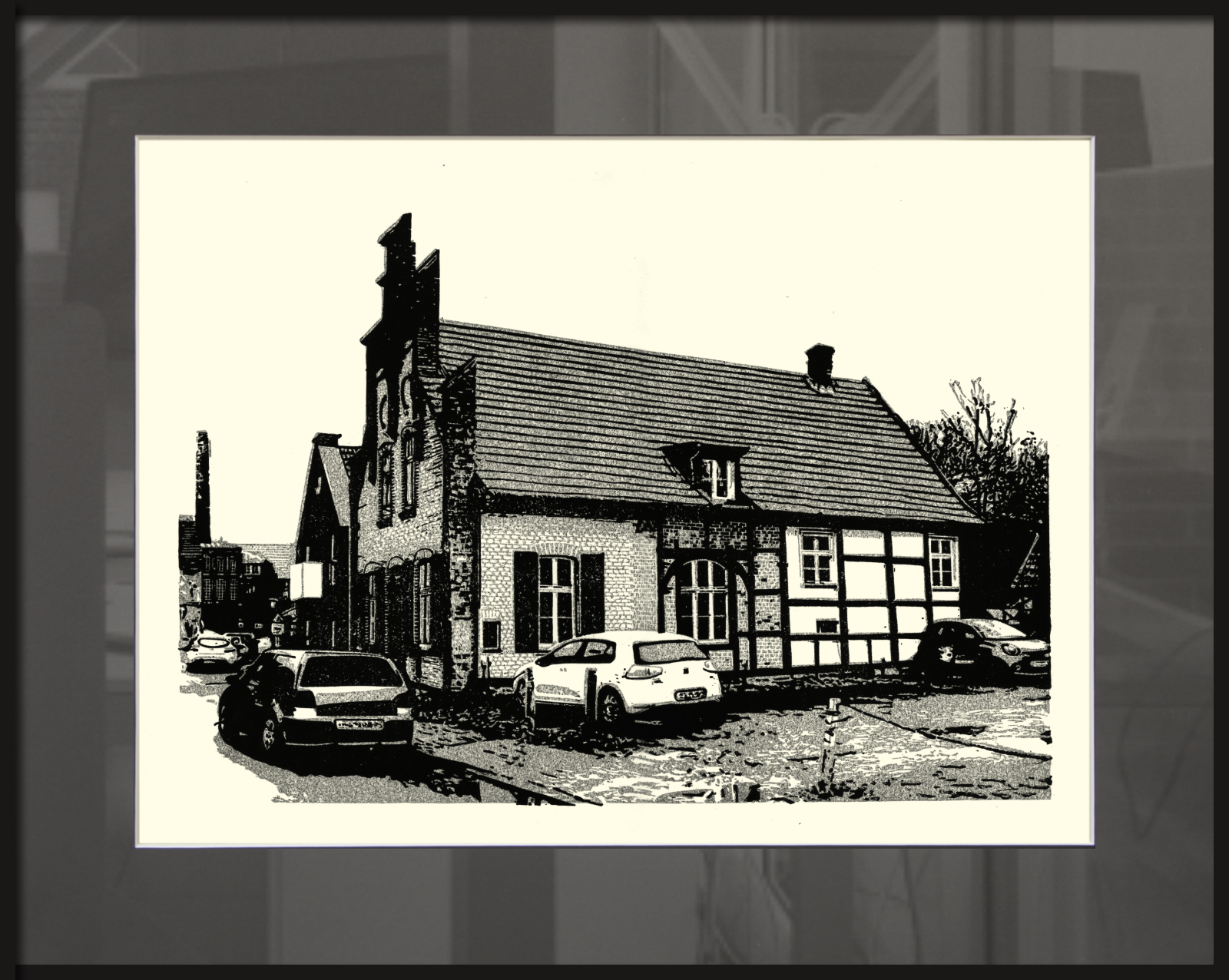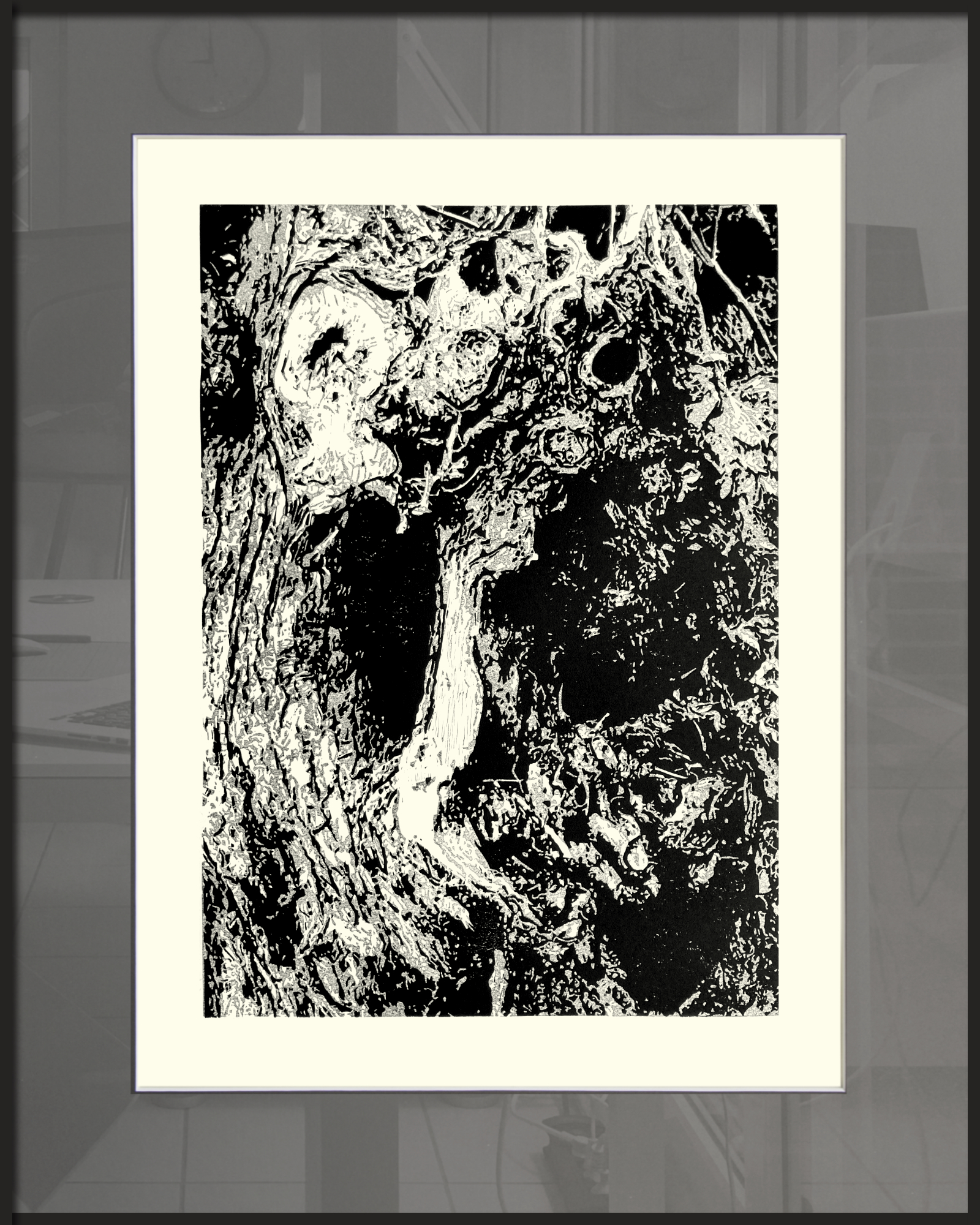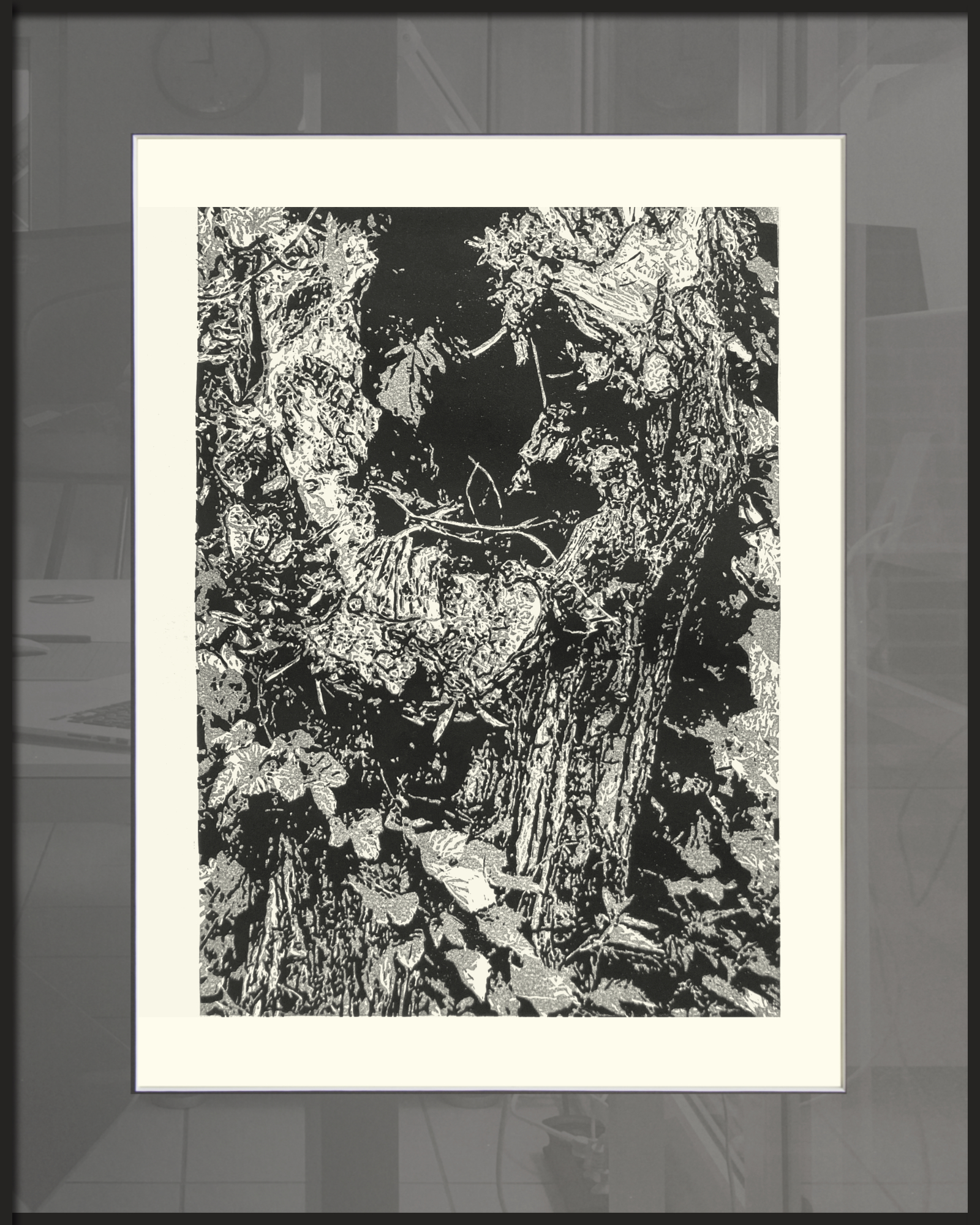 Linolschnitt (Oktober 2025) in einem Druckvorgang (Schwarz) gedruckt. 24,5 x 34,5 cm. 90 g/qm Romandruk Werkdruckpapier (leicht gelbliche Papierfarbe). Im Passepartout (dunkelgrau): 50 x 40 cm. Auflage: 12 (5/4/3)