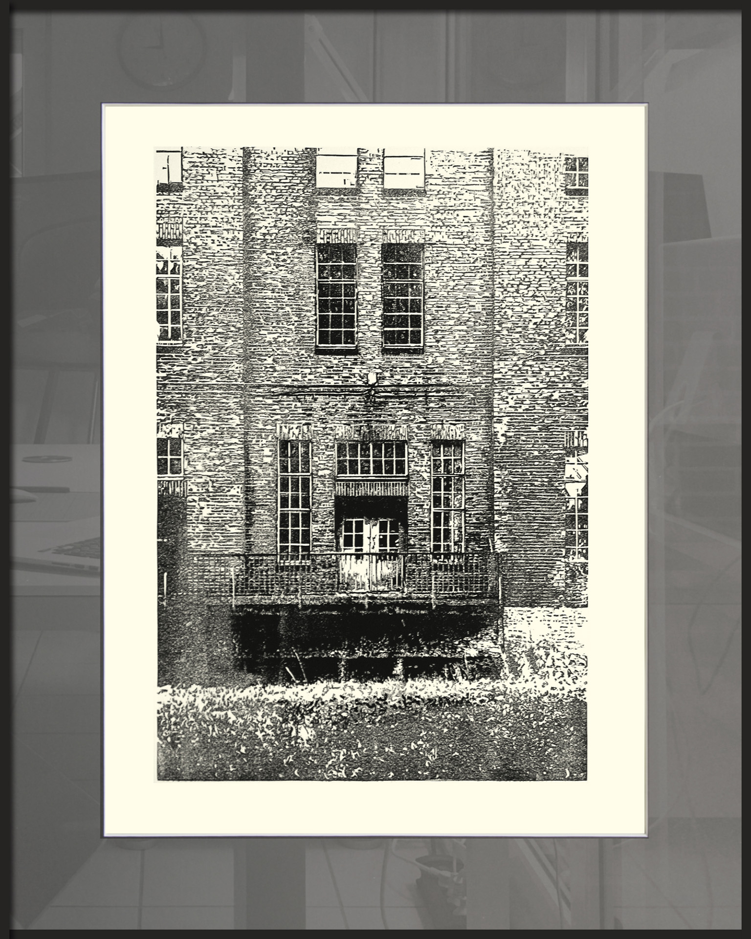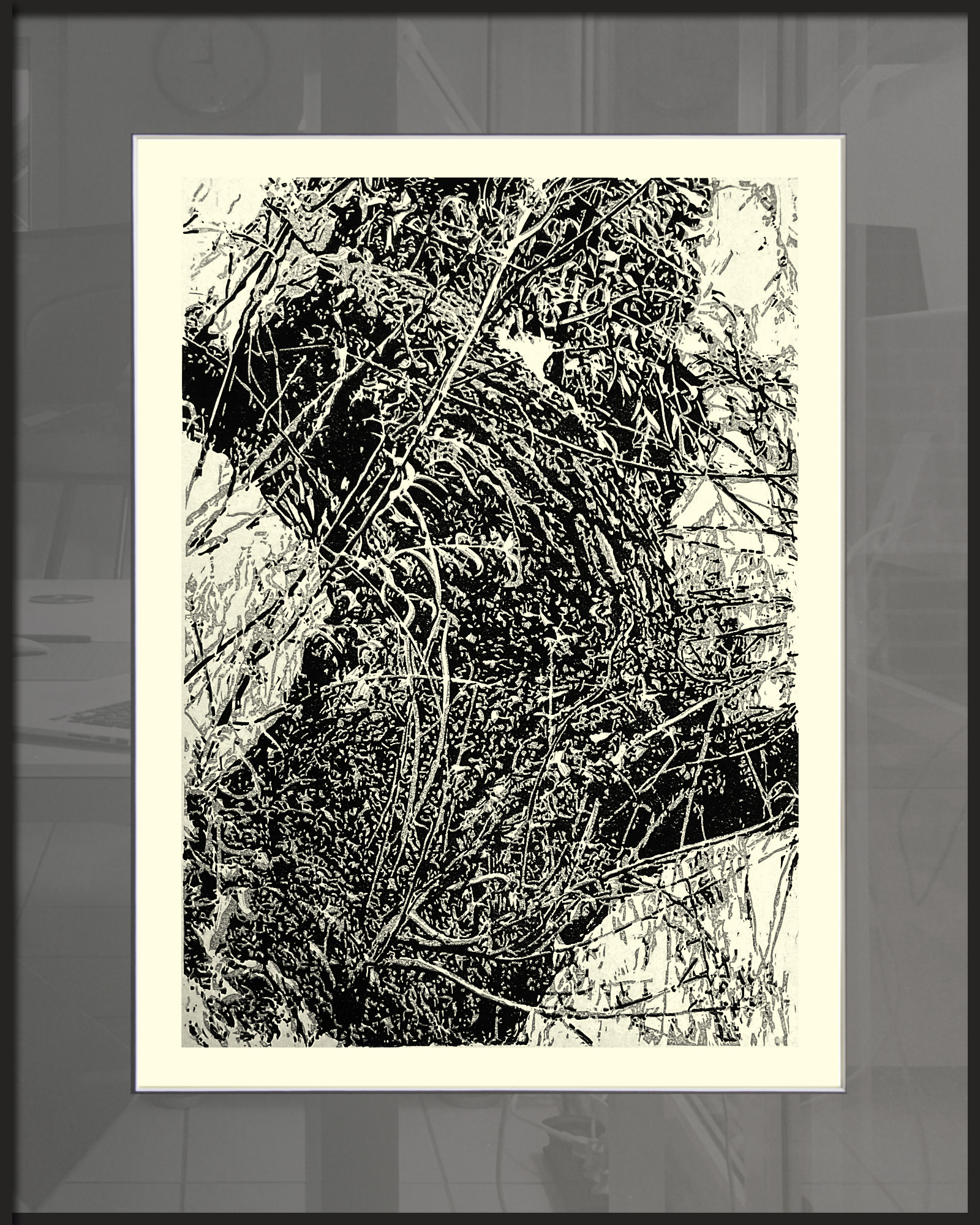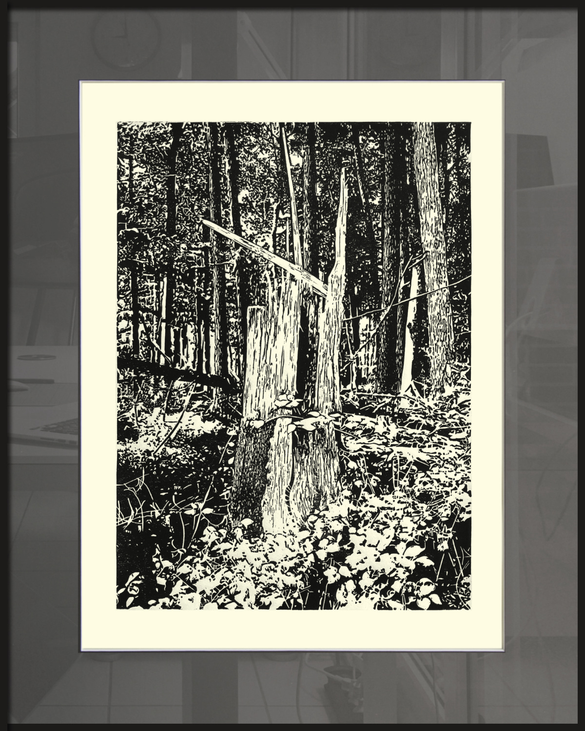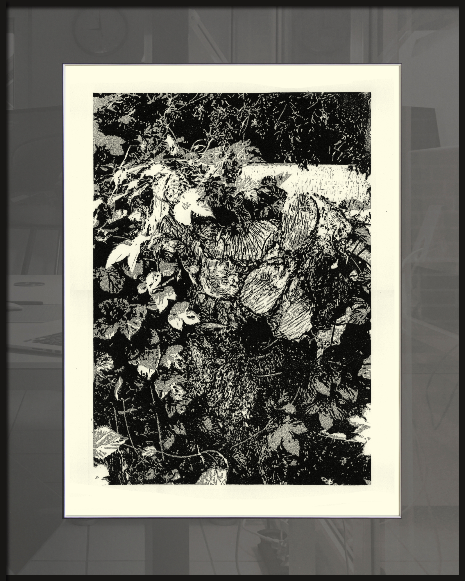 Linolschnitt (Oktober 2025) in einem Druckvorgang (Schwarz) gedruckt. 24,5 x 34,5 cm. 90 g/qm Romandruk Werkdruckpapier (leicht gelbliche Papierfarbe). Im Passepartout (dunkelgrau): 50 x 40 cm. Auflage: 12 (5/4/3)