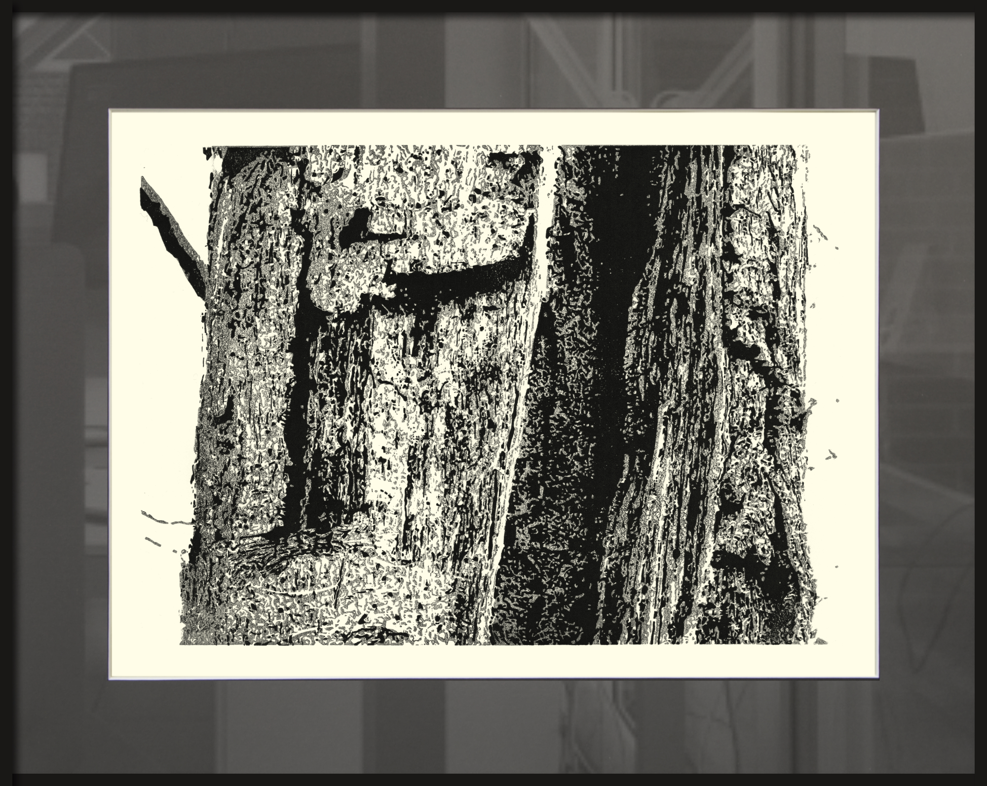 Linolschnitt (2024) in zwei Druckvorgängen (Schwarz/Grau) gedruckt. 24,5 x 34,5 cm. 90 g/qm Romandruk Werkdruckpapier (leicht gelbliche Papierfarbe). Im Passepartout (dunkelgrau): 50 x 40 cm. Auflage 10 (5/3/2)