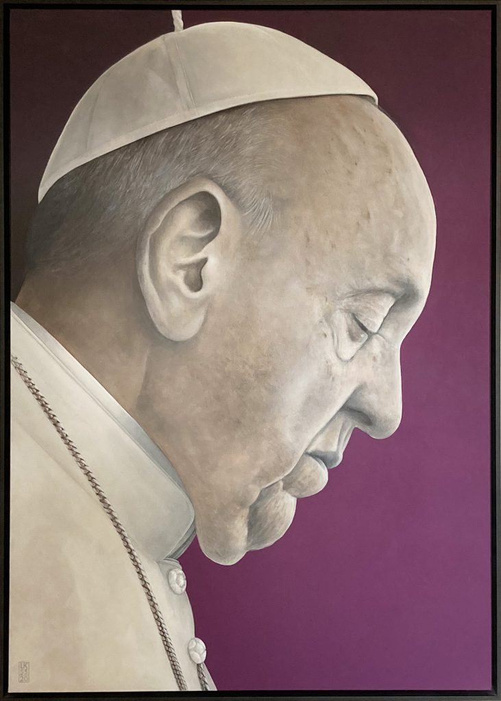 Rom, Segen Urbi et Orbi 2020. Zu diesem Zeitpunkt waren noch zwei große Bilder für die Ausstellung „menschmalerei+“ zu malen – die Hängung der Arbeiten war vorgegeben: Der direkte Blick auf die Laurentiuskirche, die als mächtiger Zeuge der Vergangenheit neben den Ausstellungsräumen des Historischen Rathauses in Warendorf in den Himmel ragt, machte die Motivauswahl leicht.